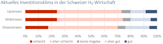 Par rapport à l'année précédente, l'estimation du climat d'investissement dans l'industrie suisse de l'hydrogène s’est dégradé à tous les niveaux de création de valeur : trois personnes sur quatre interrogées le considèrent comme négatif. Cela peut s'expliquer par le fait que les conditions-cadres gouvernementales généralement sont jugées moins bonnes, ainsi que par les prix de l'électricité qui restent élevés.