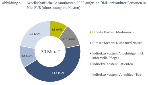 En 2023, la DMD représentait un coût estimé total de 30 Mio. EUR pour la société, soit 131’000 EUR par patient. 78% (23.5 Mio. EUR) en étaient des coûts indirects, qui se composent de perte de productivité des patients et des proches aidants et de la mort prématurée. Aux quatre stades de la maladie, les coûts indirects étaient toujours nettement supérieurs aux coûts directs. L’essentiel des coûts sociaux (48%) correspond au dernier stade de la maladie où les patients n’ont plus la capacité à marcher.